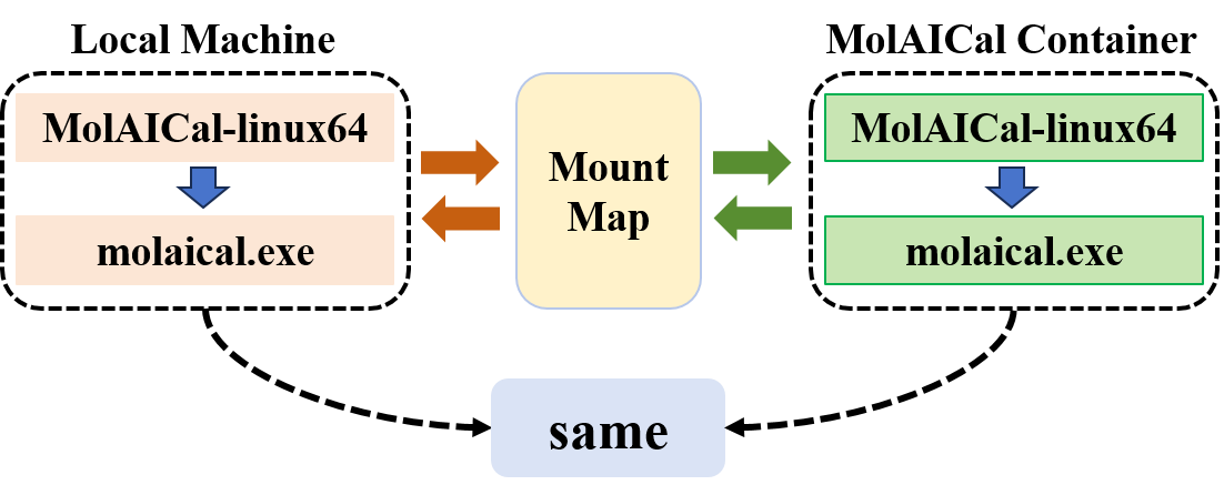 The below Figure demonstrates that due to the mapping relationship, the computational commands executed by "molalcal.exe" in the container are identical to those run by "molaical.exe" on the local machine.